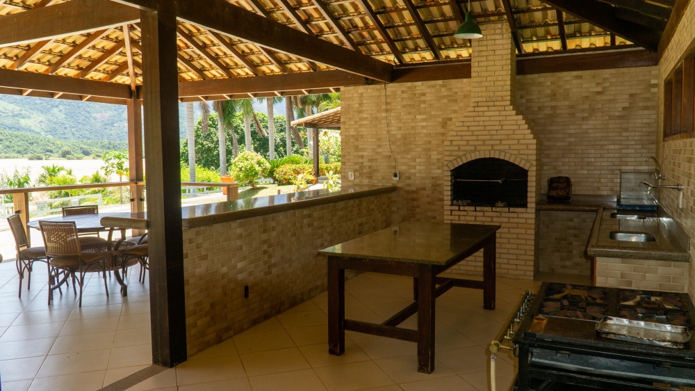Espaço aberto com varandas em volta e cozinha completa, de frente para o Rio Paraíba do Sul. Dispõe de mesas, cadeiras, churrasqueira, fogão industrial, geladeira, freezer, pia dupla com bancadas, armários, dispensa e banheiros.