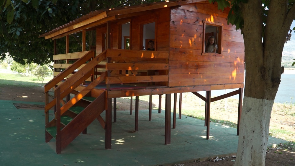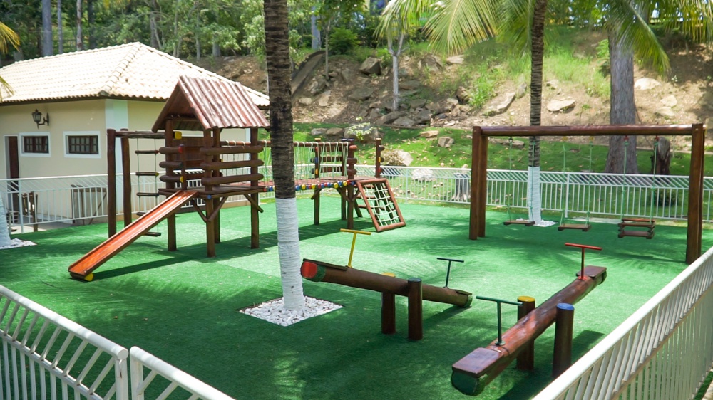 O parquinho fica próximo das piscinas, do campo de futebol e da quadra de vôlei. A casinha de brinquedos fica no pomar. A criançada adora! Leve seus pequenos 😉
